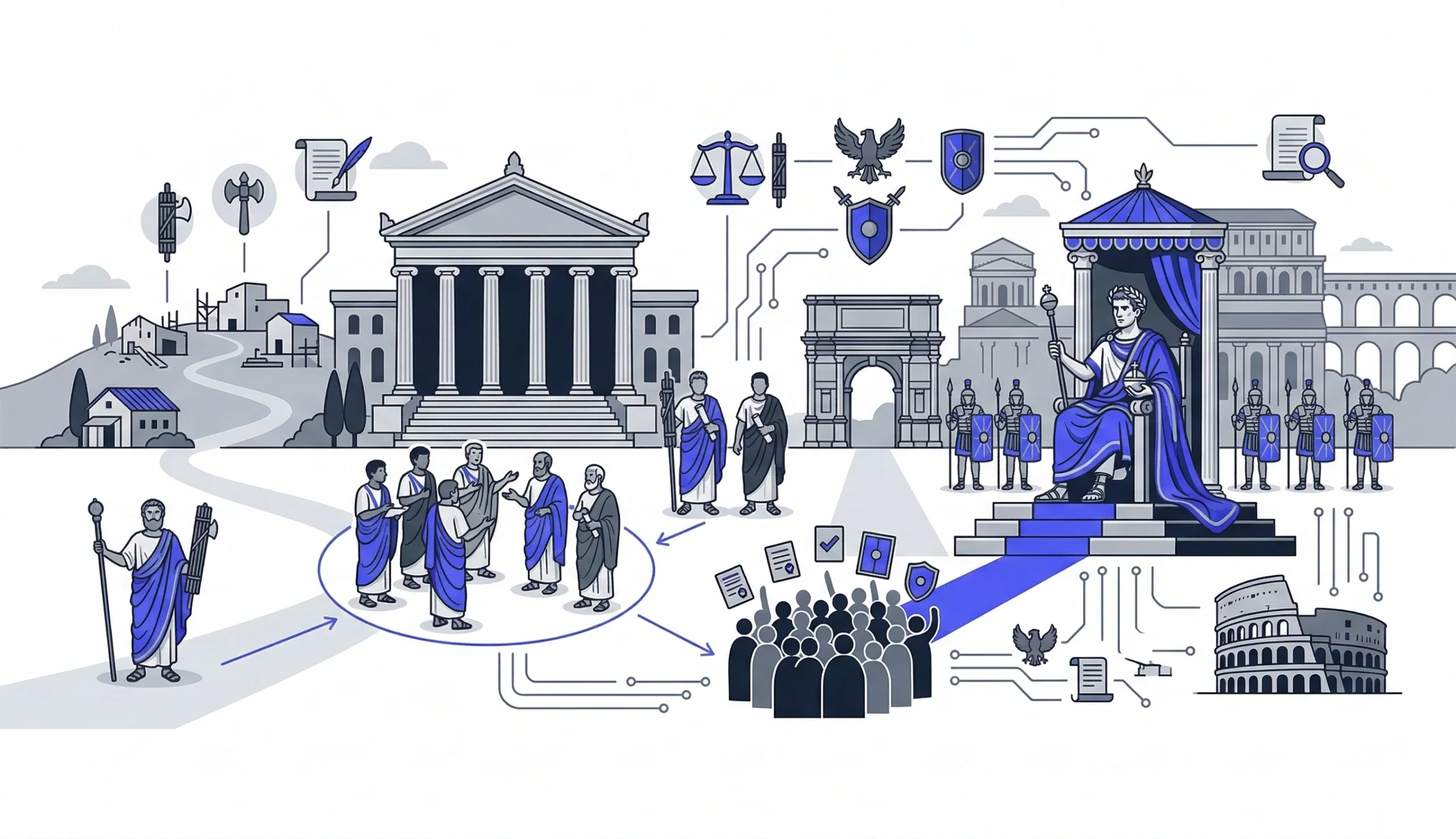 The Roman Republic introduced a more complex political system. Instead of a single ruler, several institutions shared authority.